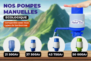 La pompe manuelle remonte l’eau de la bonbonne en appuyant sur le haut de la pompe. Elle est disponible en 3 modèles chez Natur’eau